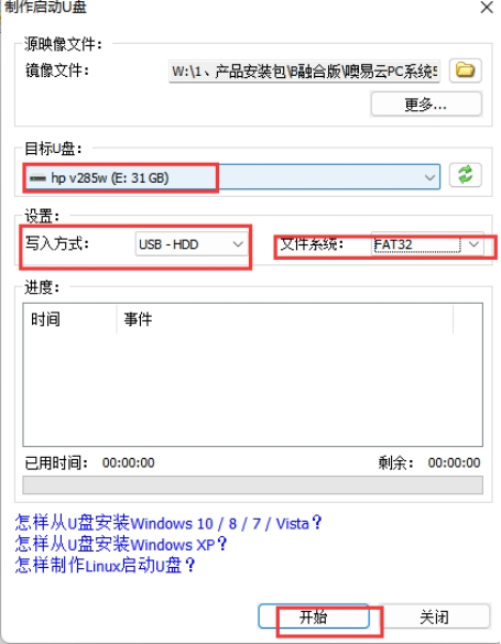 4、按照如圖所示,先將你的U盤格式化成FAT32的格式;然后選擇你的U盤,寫入方式選擇USB-HDD,文件系統(tǒng)選擇FAT32,點(diǎn)擊開始,等待進(jìn)度條走完,顯示完成后U盤就做好了,點(diǎn)擊關(guān)閉,退出U盤。