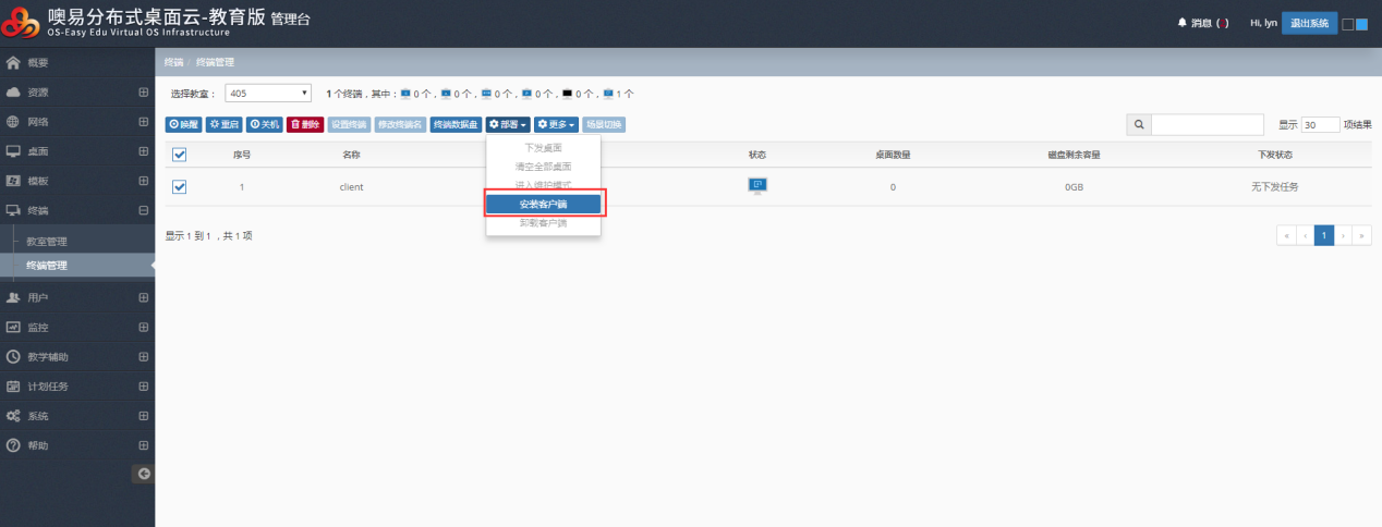 4.該終端連入默認教室中,在終端管理/該默認教室/部署功能中執(zhí)行安裝客戶端(安裝客戶端時分配的IP確保是能和服務(wù)器能正常通信的IP段)