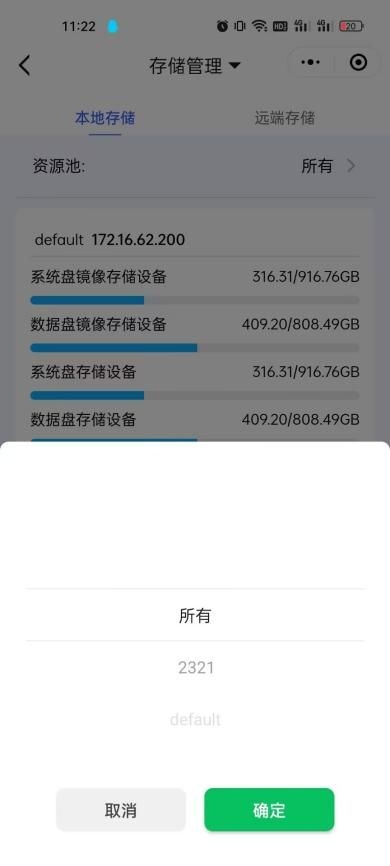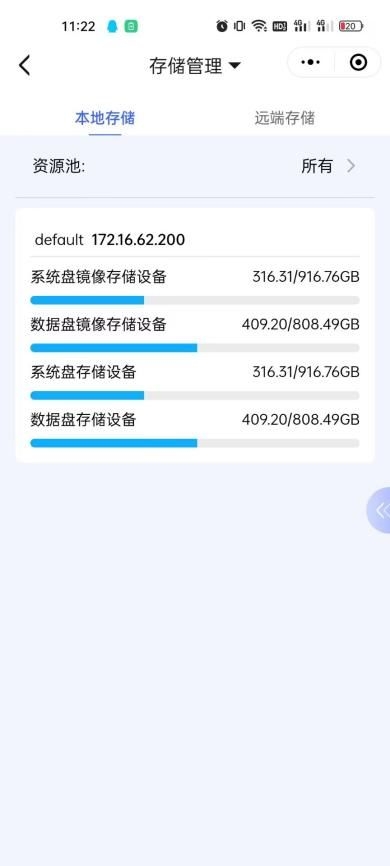 1、進(jìn)入小程序后,點(diǎn)擊『功能臺(tái)』→【資源】界面,點(diǎn)擊頂部切換【存儲(chǔ)管理】→【本地存儲(chǔ)】頁(yè)面;可點(diǎn)擊右側(cè)展開彈窗,選擇其他資源池,查看存儲(chǔ)使用詳情;