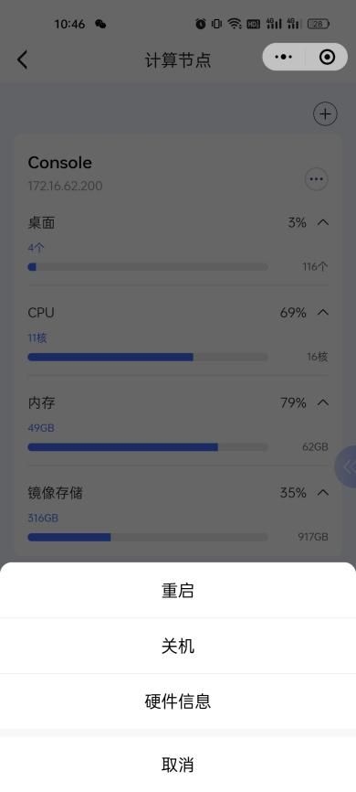 2、點(diǎn)擊資源池,進(jìn)入其下的計(jì)算節(jié)點(diǎn)界面;點(diǎn)擊【更多】,展開【重啟】、【關(guān)機(jī)】、【硬件信息】按鈕;