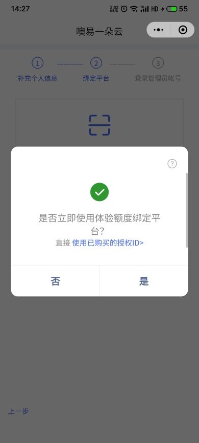 2)每個平臺提供1個體驗額度授權(quán)(使用有效期為6個月),在授權(quán)選擇上可以選擇【立即使用體驗額度綁定平臺】,選擇體驗授權(quán)還需要最高管理員admin在web管理臺上同意后才可使用(小程序管理窗口-體驗額度管理-申請信息頁面),在體驗授權(quán)到期之前若未進(jìn)行商業(yè)授權(quán)激活,則到期后無法繼續(xù)使用小程序(不影響繼續(xù)使用web管理臺)。