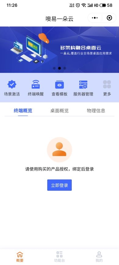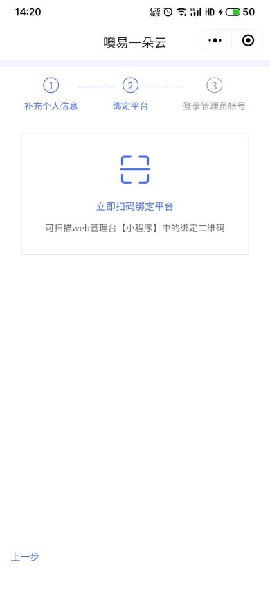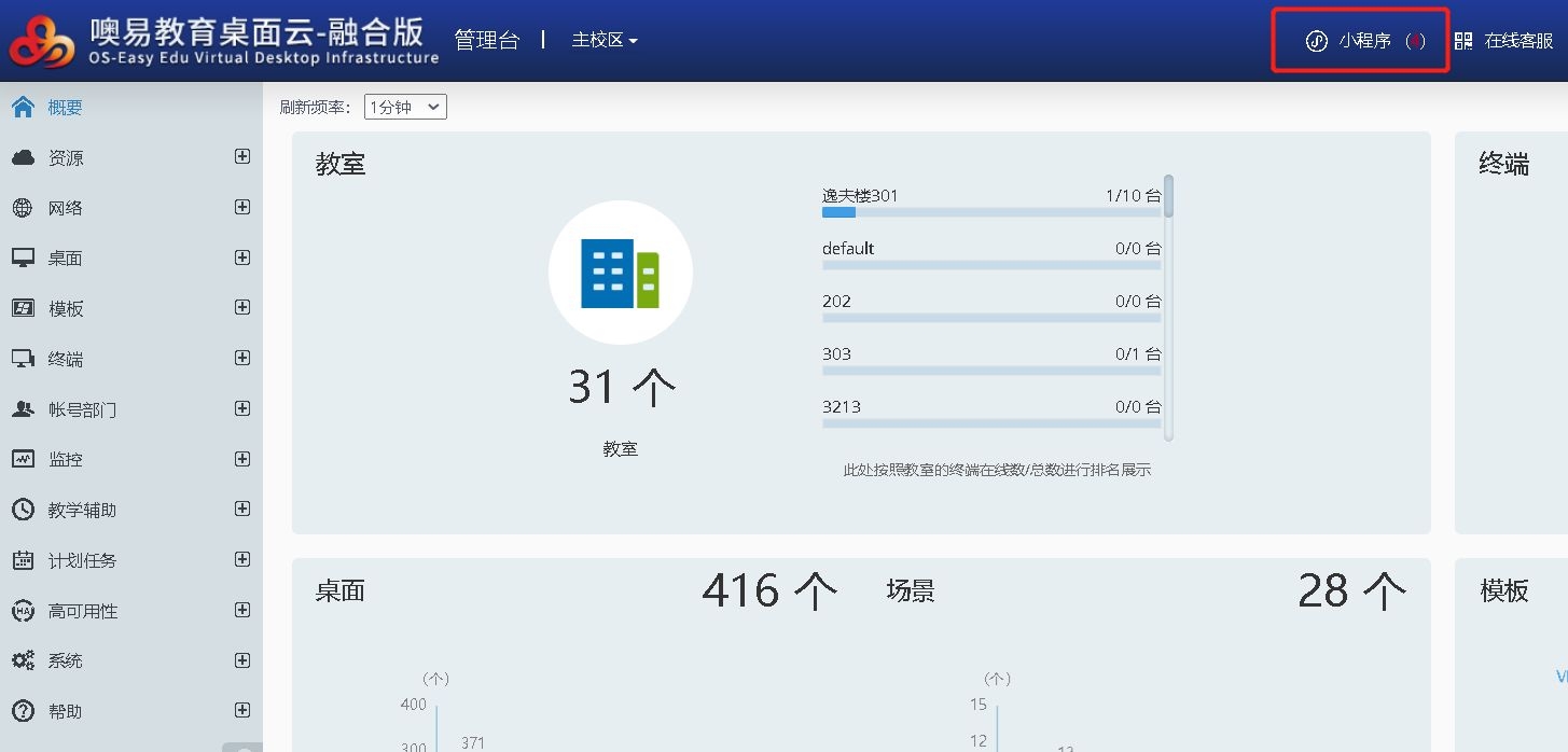 1、點擊主控服務(wù)器桌面云管理平臺,點擊【小程序】,彈出小程序管理臺窗口,使用“噢易一朵云”微信小程序,點擊【立即掃碼綁定平臺】,掃描管理臺的二維碼。