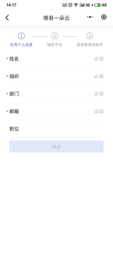 3、然后補(bǔ)充個人信息【姓名】、【組織】、【部門】、【郵箱】、【職位】→點擊【保存】,進(jìn)入第二步,綁定平臺頁面。