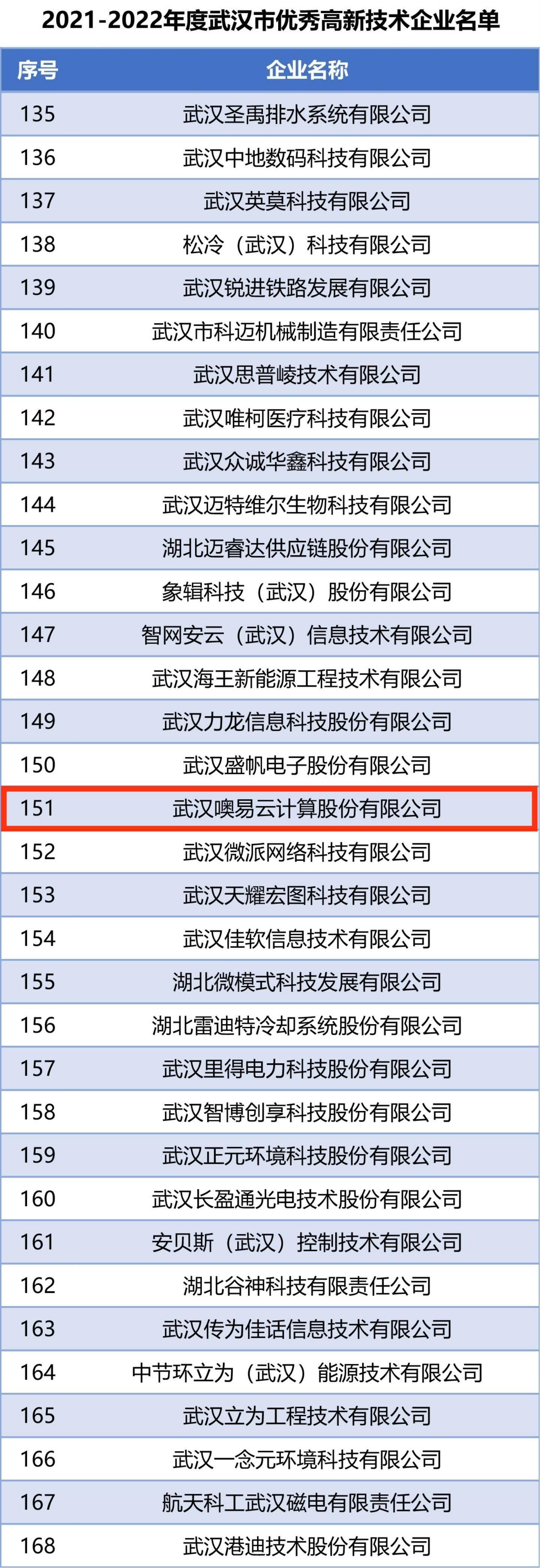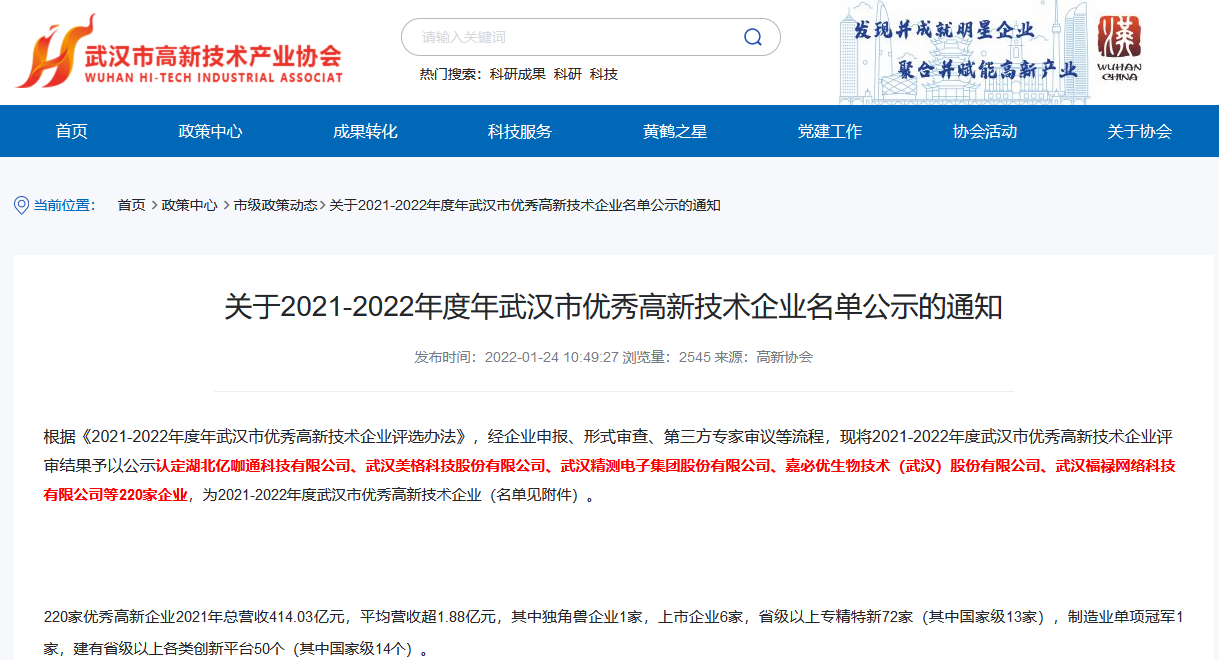 2021-2022年度年武漢市優秀高新技術企業公示名單(圖)