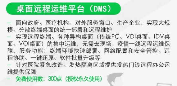 2) 實現遠程終端、各種異構桌面(傳統PC、VDI桌面、IDV桌面、VOI桌面)的集中運維,無需去現場,疫情一線遠程運維保障,服務功能:終端環境快速部署、網絡配置和安全管控、遠程協助、一鍵還原、軟件批量升級等;