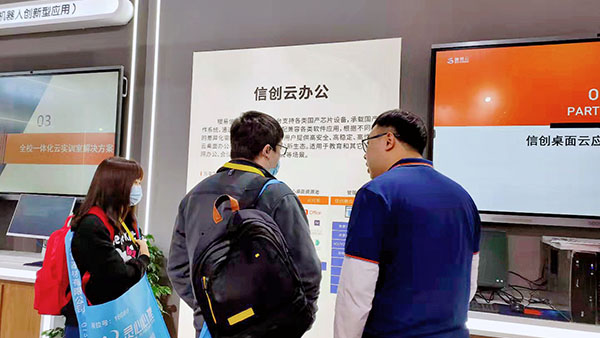 云實(shí)訓(xùn)室教學(xué)產(chǎn)品現(xiàn)場展示并進(jìn)行熱烈討論(圖) (云實(shí)訓(xùn)室展示區(qū)交流熱烈,云教室系統(tǒng)在各場景中的應(yīng)用得到專家和領(lǐng)導(dǎo)的認(rèn)可) 四、 信創(chuàng)云辦公,打造可信安全的教學(xué)辦公環(huán)境(加快國產(chǎn)化替代進(jìn)程) 教育部等六部門印發(fā)《關(guān)于推進(jìn)教育新型基礎(chǔ)設(shè)施建設(shè)構(gòu)建高質(zhì)量教育支撐體系的指導(dǎo)意見》,意見提出將可信安全新型基礎(chǔ)設(shè)施作為教育重點(diǎn)發(fā)展方向之一。目前, 信創(chuàng)產(chǎn)業(yè)主要產(chǎn)品和核心技術(shù)已經(jīng)實(shí)現(xiàn)了從“不可用”向“基本可用”的轉(zhuǎn)變,并且正在向“好用易用”大跨步邁進(jìn),面臨國產(chǎn)終端替代難題,采用桌面云技術(shù)是實(shí)現(xiàn)國產(chǎn)終端替代過程的最佳方案。 此次展會(huì)上,噢易云全面展示 信創(chuàng) 云辦公、信創(chuàng)云桌面教學(xué)空間、 信創(chuàng)云應(yīng)用三大產(chǎn)品方案。其中,噢易信創(chuàng) 融合桌面云平臺(tái)支持各類國產(chǎn)芯片設(shè)備,承載國產(chǎn)操作系統(tǒng),通過云應(yīng)用技術(shù)全面適配兼容各類軟件應(yīng)用,根據(jù)不同崗位的差異化需求,按需配置桌面,為用戶提供高安全、高穩(wěn)定、高性能的云桌面辦公環(huán)境,構(gòu)筑安全、敏捷、高效的 信創(chuàng)辦公應(yīng)用生態(tài),全面滿足中小學(xué)計(jì)算機(jī)云課堂教學(xué)、教師 云辦公等多場景應(yīng)用需求。