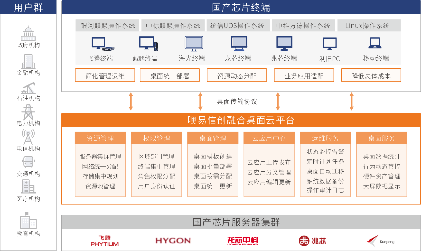 噢易 信創(chuàng) 融合桌面云平臺架構(gòu)(圖) ● 在向國產(chǎn)設(shè)備和操作系統(tǒng)遷移過程中,部分Windows應(yīng)用因改造難度大、重寫成本高等因素暫時不能遷移適配的問題,可以利用 云桌面/云應(yīng)用方案進(jìn)行過渡,實現(xiàn)已改造應(yīng)用和未改造應(yīng)用"雙軌運行",保證業(yè)務(wù)穩(wěn)定和連續(xù)。 ● 針對用戶原有硬件設(shè)備,利用桌面云平臺可以實現(xiàn)兼容利舊,大幅提升現(xiàn)有硬件資源的利用率,節(jié)省項目經(jīng)費,保護(hù)用戶投資。 ● 桌面云平臺在對終端和桌面統(tǒng)一集中管理、簡化運維、故障恢復(fù)、資源分配、數(shù)據(jù)安全、移動辦公等方面較傳統(tǒng)PC管理模式有巨大優(yōu)勢,符合未來信息化發(fā)展趨勢。 ● 符合"能替盡替,真替真用"的整體目標(biāo),有效保障國產(chǎn)化終端和操作系統(tǒng)的日常辦公使用率,推動信創(chuàng)產(chǎn)業(yè)快速發(fā)展。 作為專業(yè)的桌面云方案提供商,噢易云始終致力于通過云計算、桌面云服務(wù)、智能物聯(lián)網(wǎng)、邊緣計算等前沿技術(shù)的研發(fā)和技術(shù)創(chuàng)新為用戶提供 云電腦辦公、 信創(chuàng)桌面云、智慧教育等系列軟硬件產(chǎn)品,以及行業(yè)深度融合的全場景一體化解決方案。未來,噢易云也將持續(xù)深耕政府行業(yè),加快信息技術(shù)應(yīng)用創(chuàng)新產(chǎn)業(yè)的發(fā)展及應(yīng)用,以一朵云,覆蓋行業(yè)全場景桌面應(yīng)用需求。