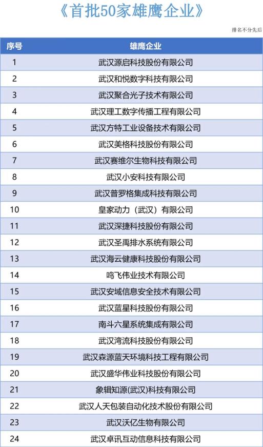 武漢市高新技術產業協會執行會長吳劍文表示此次選拔均是按照《雄鷹高企認定標準》要求,從創新能力、市場競爭力、抗風險能力和良好發展前景等維度進行定量評比,最終決出首批的50家雄鷹企業名單。