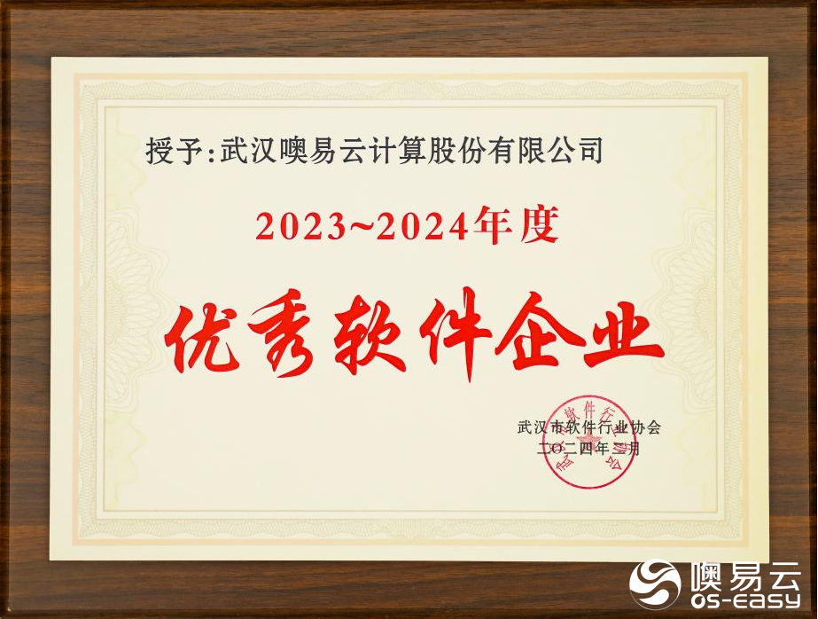 近日,武漢市軟件行業協會第五屆四次會員代表大會順利召開,會上對2023-2024年度優秀企業和優秀工作者進行了表彰。武漢 噢易云計算股份有限公司憑借雄厚的技術創新能力與先進的軟件產品榮獲“2023-2024年度優秀軟件企業”榮譽稱號。