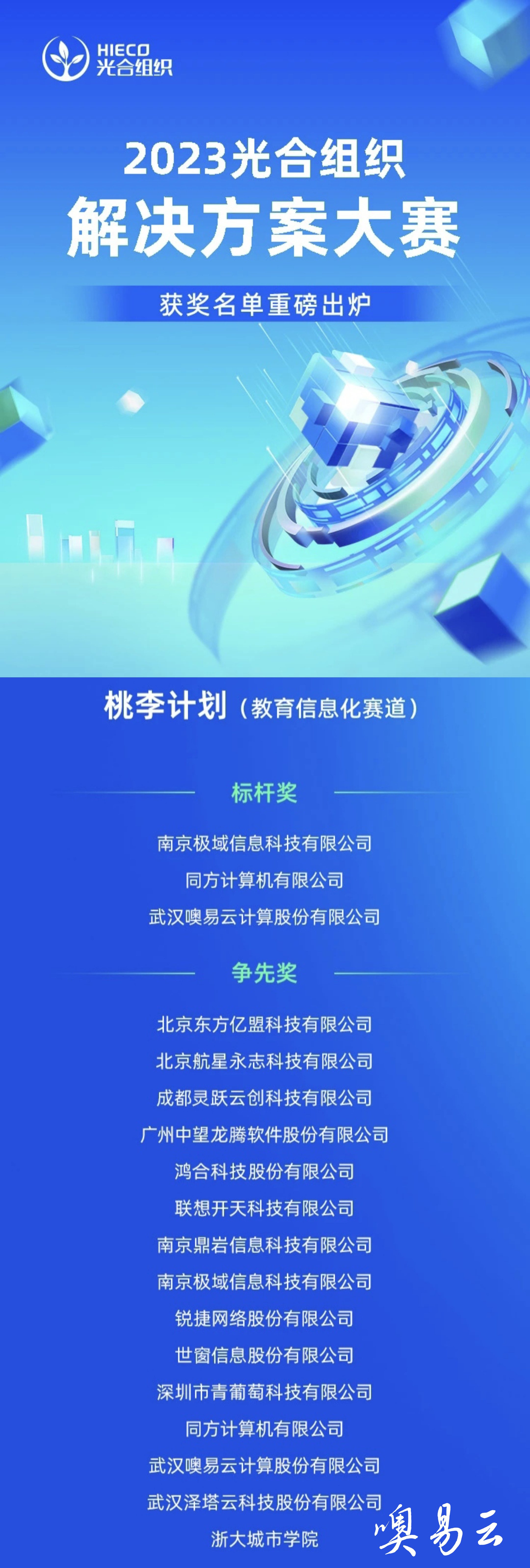 近日,2023年第三屆光合組織解決方案大賽獲獎名單重磅發(fā)布,武漢 噢易云計算有限公司憑借“面向高校的 信創(chuàng)云實訓室解決方案”從決賽的100 隊伍中脫穎而出,榮膺桃李計劃(教育信息化)標桿獎與爭先獎!