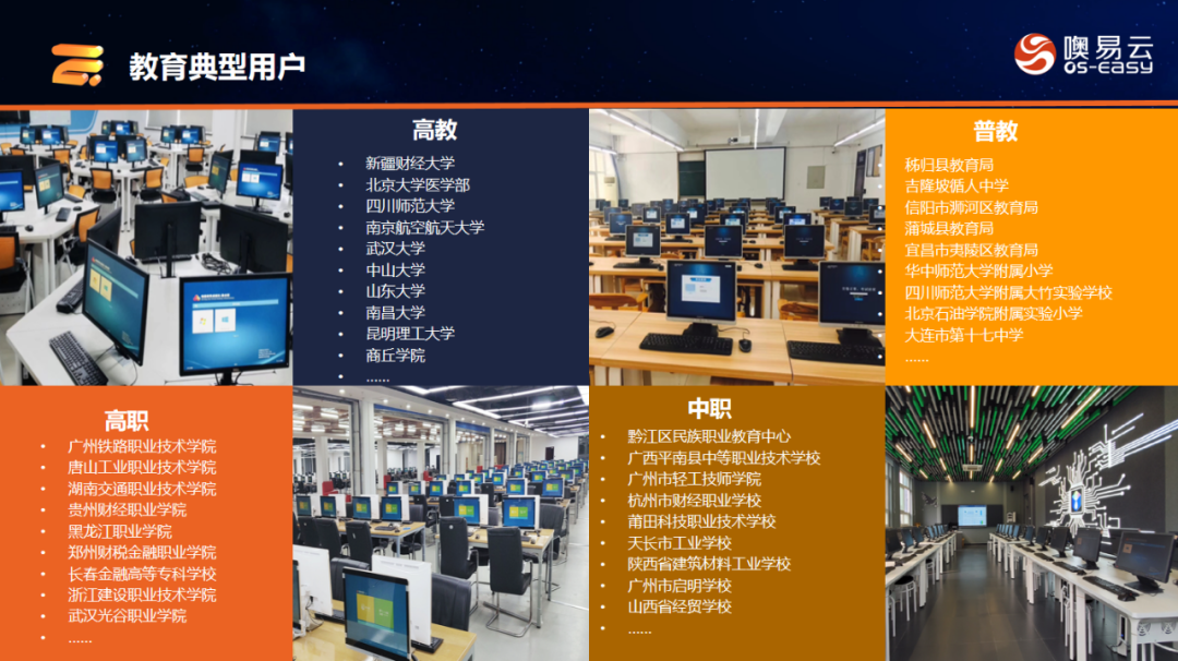 在教育行業(yè),噢易云作為 教育桌面云領(lǐng)先品牌,針對(duì)教育領(lǐng)域細(xì)分市場(chǎng),發(fā)布面向高教的全校一體化融合桌面云解決方案、新基建 新一代智慧實(shí)驗(yàn)室解決方案、 智慧校園線上實(shí)驗(yàn)空間服務(wù)解決方案、實(shí)驗(yàn)室上機(jī)和課程預(yù)約管理解決方案、分布式 VOI桌面云解決方案、實(shí)驗(yàn)機(jī)房系統(tǒng)還原部署解決方案、多媒體互動(dòng)教學(xué)解決方案,面向普教的區(qū)校一體化融合云教室解決方案、中小學(xué)云教室解決方案,全方位多維度助力教育信息化高質(zhì)量發(fā)展,推動(dòng)“數(shù)字中國(guó)”建設(shè)。
