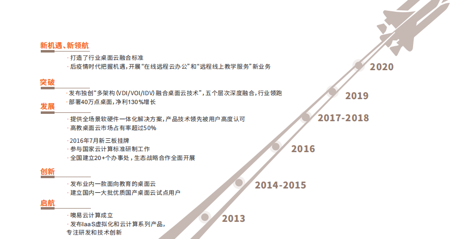 自2013年成立以來,噢易云不斷提升企業經營管理能力,提高技術創新水平,擴大經營規模, 創建了全面自主知識產權的產品、全國的營銷網絡、以及 本地化的技術服務團隊,致力于通過云計算、桌面虛擬化、智能桌面、邊緣計算等 前沿技術的研發,為政府、教育、醫療、企業、能源等行業客戶,提供終端桌?運維、 多架構融合桌?云、在線遠程辦公、在線遠程教學等系列產品及深度融合的全場景軟硬件?體化解決方案。