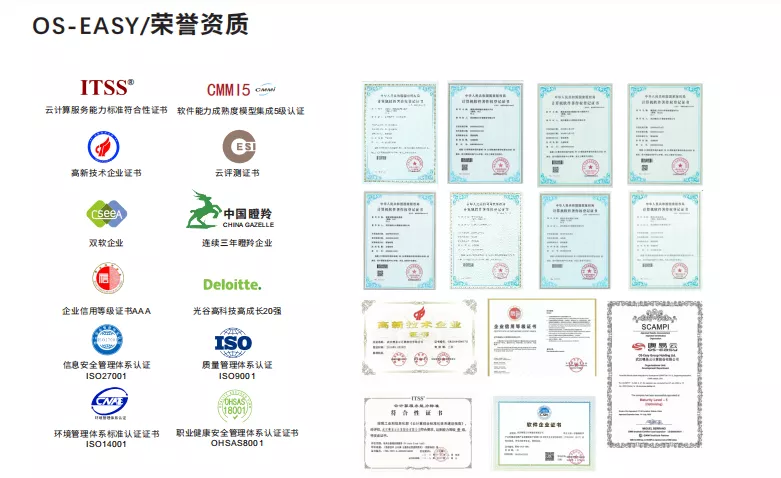 公司先后榮獲云計算服務能力標準符合性證書,軟件能力成熟度模型集成5級認證、云評測證書、高新技術企業證書等諸多行業認可資質證書,并參與國家云計算標準研制工作。