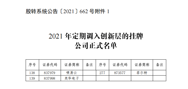 近日,全國中小企業股份轉讓系統向市場公布《 202 1 年 定期調入創新層的掛牌公司正式名單 》。 噢易云從眾多新三板掛牌企業中脫穎而出,成功邁入 “ 新三板創新層”。 這是繼2016年7月公司在全國股轉系統成功掛牌后,在資本市場取得的又一階段性成果,標志著公司在管理水平、業務規模以及經營業績達到了新的高度,公司發展駛入快車道!