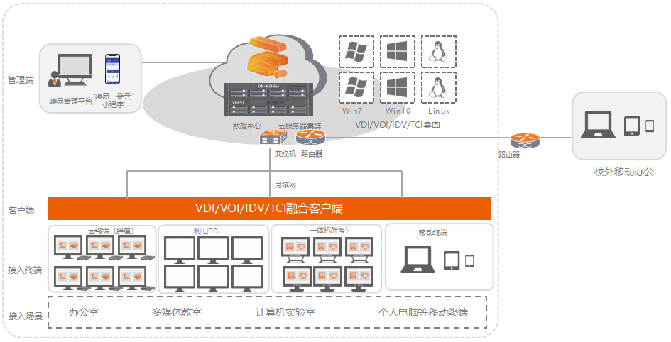 以云桌面技術(shù)為核心,通過(guò)融合VDI、VOI、IDV和TCI等多種架構(gòu),為教師打造了一個(gè)高效、靈活、穩(wěn)定的辦公環(huán)境。