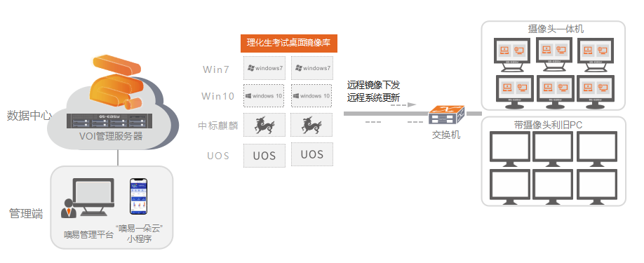 面向中考理化生等上機(jī)考試場景,提供理化生機(jī)考考場解決方案,通過噢易云教室系統(tǒng)VOI架構(gòu)的高兼容性和便捷的統(tǒng)一部署、統(tǒng)一管理能力結(jié)合攝像頭一體機(jī)的攝像功能及本地高性能,實(shí)現(xiàn)按需交付實(shí)驗(yàn)實(shí)訓(xùn)、學(xué)生自主訓(xùn)練、考試競賽所需的教學(xué)應(yīng)用系統(tǒng)和環(huán)境,通過?致的Web視圖界面,實(shí)現(xiàn)機(jī)房、設(shè)備、桌面的統(tǒng)一管理和集中運(yùn)維。
