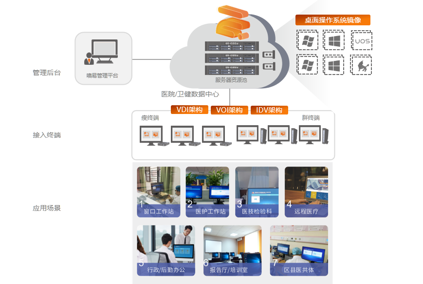 面向醫(yī)院、縣域醫(yī)共體場(chǎng)景,以一朵云融合交付模式為核心,實(shí)現(xiàn)辦公使用、桌面運(yùn)維管理在云端,它支持快速便捷的終端桌面環(huán)境創(chuàng)建、部署、統(tǒng)一管控與運(yùn)維。
