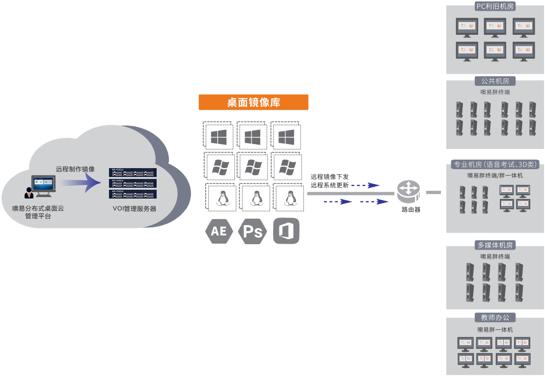 噢易分布式桌面云解決方案是一套全新的針對(duì)大批量計(jì)算機(jī)集中管理和維護(hù)的解決方案,實(shí)現(xiàn)了大規(guī)模分散、異構(gòu)終端的統(tǒng)一管理和維護(hù),遠(yuǎn)程進(jìn)行桌面的統(tǒng)一部署和更新,管理運(yùn)維人員無(wú)需到現(xiàn)場(chǎng)即可對(duì)機(jī)房進(jìn)行遠(yuǎn)程管理。