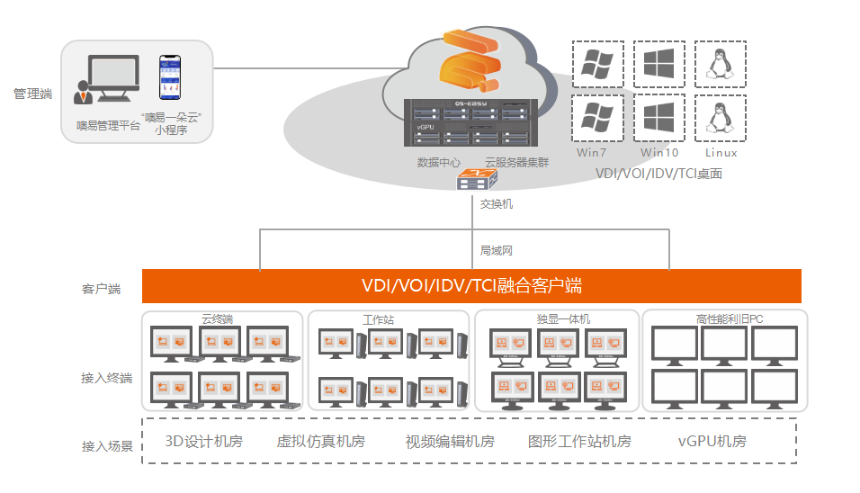噢易桌面云系統(tǒng)提供智能PNP驅(qū)動技術(shù),可實現(xiàn)對不同批次不同配置的異購終端系統(tǒng)的兼容,支持對終端異構(gòu)計算機(jī)進(jìn)行統(tǒng)一管理,一個操作系統(tǒng)鏡像可適用所有不同類型的PC更新一個鏡像,便可達(dá)到更新全部終端的目的,大大降低管理維護(hù)工作,提升管理效率。