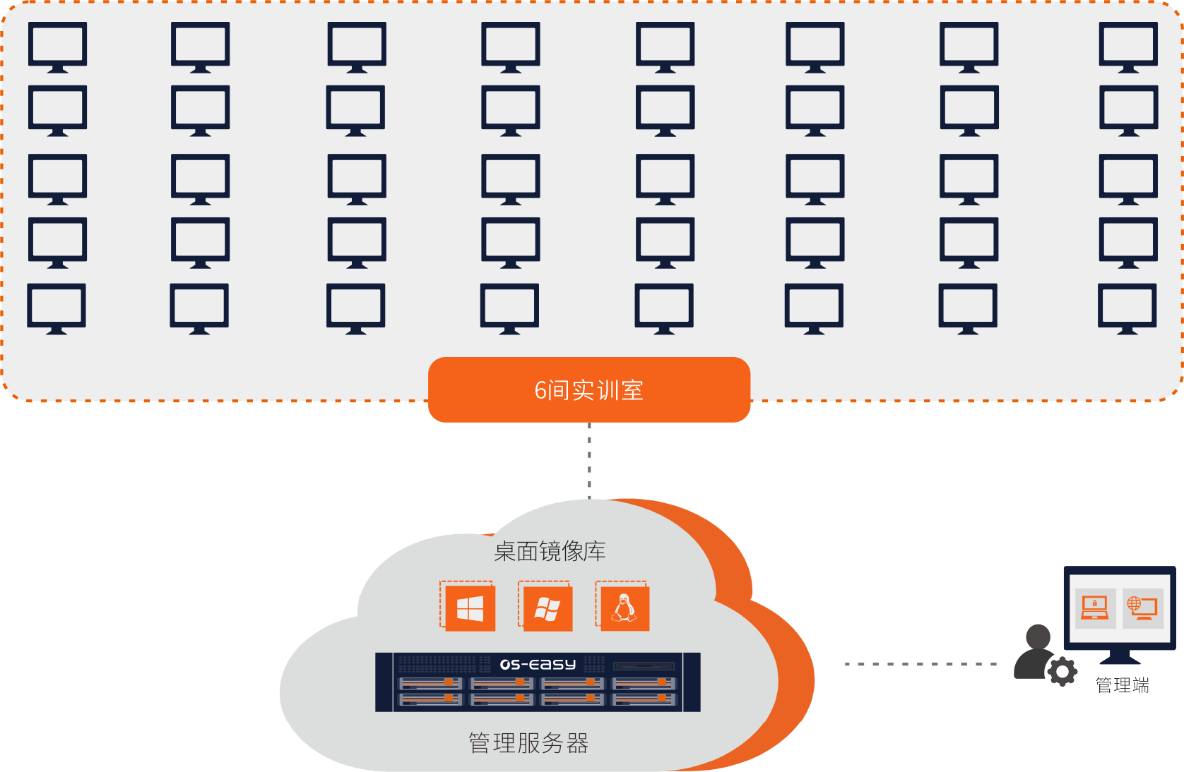 學(xué)校不同專業(yè)的實(shí)驗(yàn)室,都分布在各個(gè)樓宇和不同的樓層,管理維護(hù)壓力和工作量十分巨大。使用的終端購(gòu)買的年限和批次也都不統(tǒng)一,需要構(gòu)建集中統(tǒng)一的終端桌面部署、管理和維護(hù)平臺(tái)。