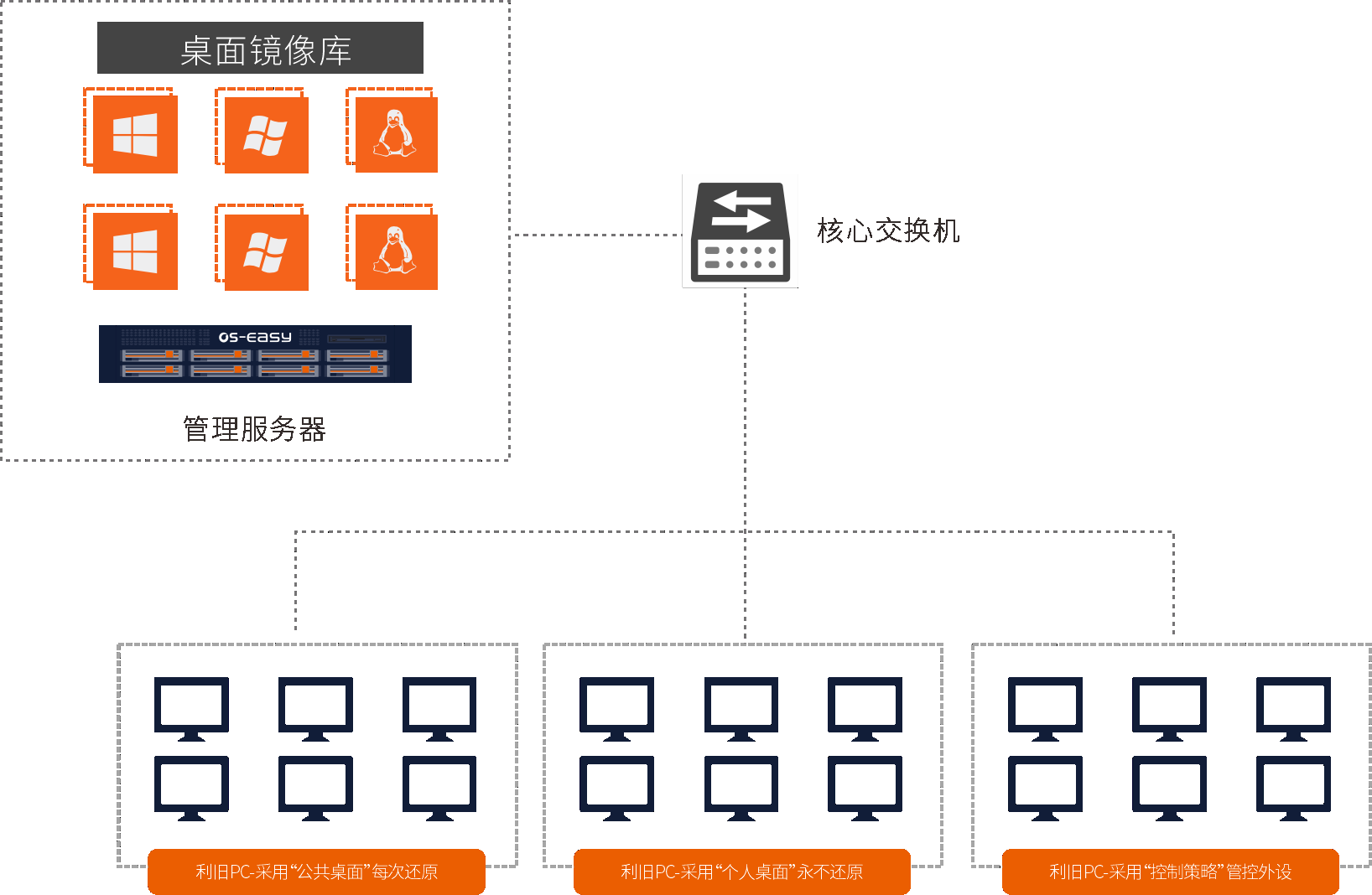 本次利舊改造現(xiàn)有的100臺(tái)終端,統(tǒng)一交付VOI桌面云,利用一臺(tái)服務(wù)器進(jìn)行所有終端桌面的統(tǒng)一資源管理及系統(tǒng)下發(fā),充分利用現(xiàn)有資源,保護(hù)既往的投資,同時(shí)實(shí)現(xiàn)分散終端的統(tǒng)一管理運(yùn)維,提高運(yùn)維效率。