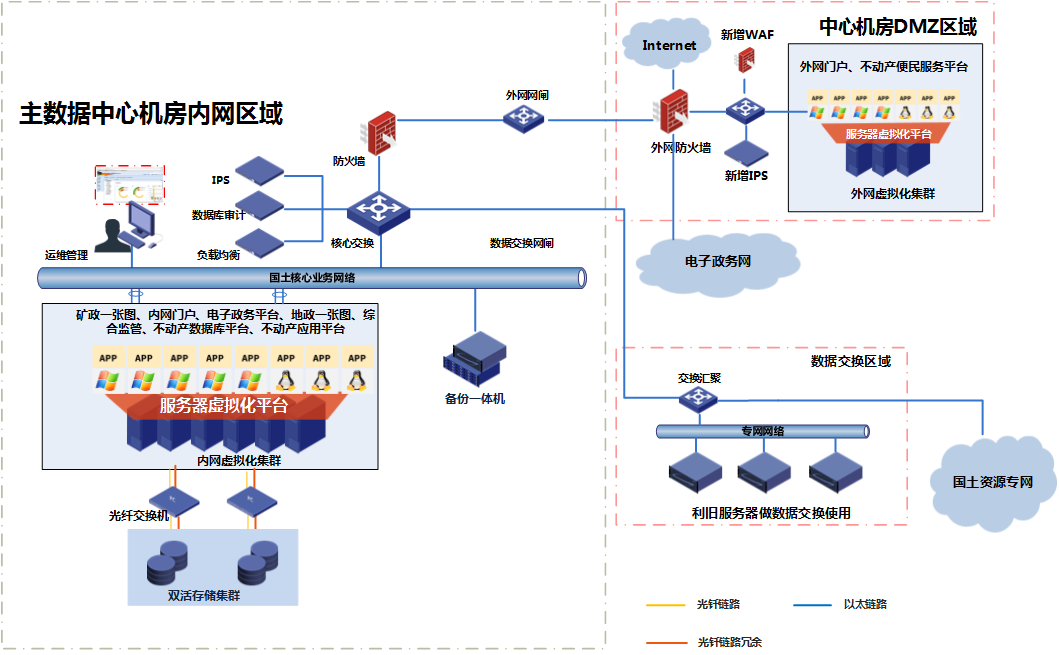 符合全國國土資源網(wǎng)絡整體規(guī)劃,同時增加網(wǎng)絡安全(防火墻、IPS、負載均衡、審計等),強化數(shù)據(jù)中心網(wǎng)絡安全,保障國土業(yè)務安全上線。