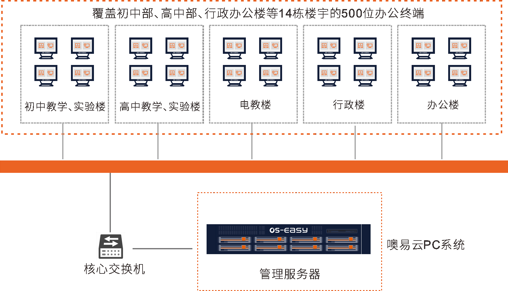 為了更好地提高教學質量,滿足教師辦公及教學的需求,宣威市第十中學于2021年對教師辦公環(huán)境進行改造,攜手噢易云共部署500點噢易云PC系統(tǒng),分布在14棟教學樓、實驗樓、電教樓、行政辦公樓。