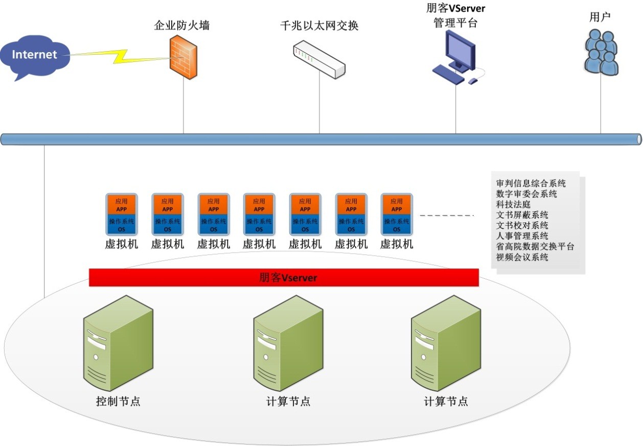 利用高性能服務(wù)器集群配合噢易OE-VServer虛擬化軟件,配置共享高效存儲系統(tǒng)和一體化備份系統(tǒng),將審判信息綜合系統(tǒng)、案件查詢系統(tǒng)、數(shù)字審委會系統(tǒng)、科技法庭、文書屏蔽系統(tǒng)、文書校對系統(tǒng)、人事管理系統(tǒng)等系統(tǒng)整合到虛擬化云平臺中。通過配置服務(wù)器虛擬化群集和備份恢復(fù)等高級功能,以實現(xiàn)群集計算、統(tǒng)一存儲、統(tǒng)一備份、集中管理、資源彈性擴展、易于維護升級等目標(biāo)。從而達到隨州市中院數(shù)據(jù)中心高效率、高性價比、智能化管理和信息安全等要求,為后續(xù)5-10年隨州中院信息化發(fā)展提供可擴展的硬件支持平臺。