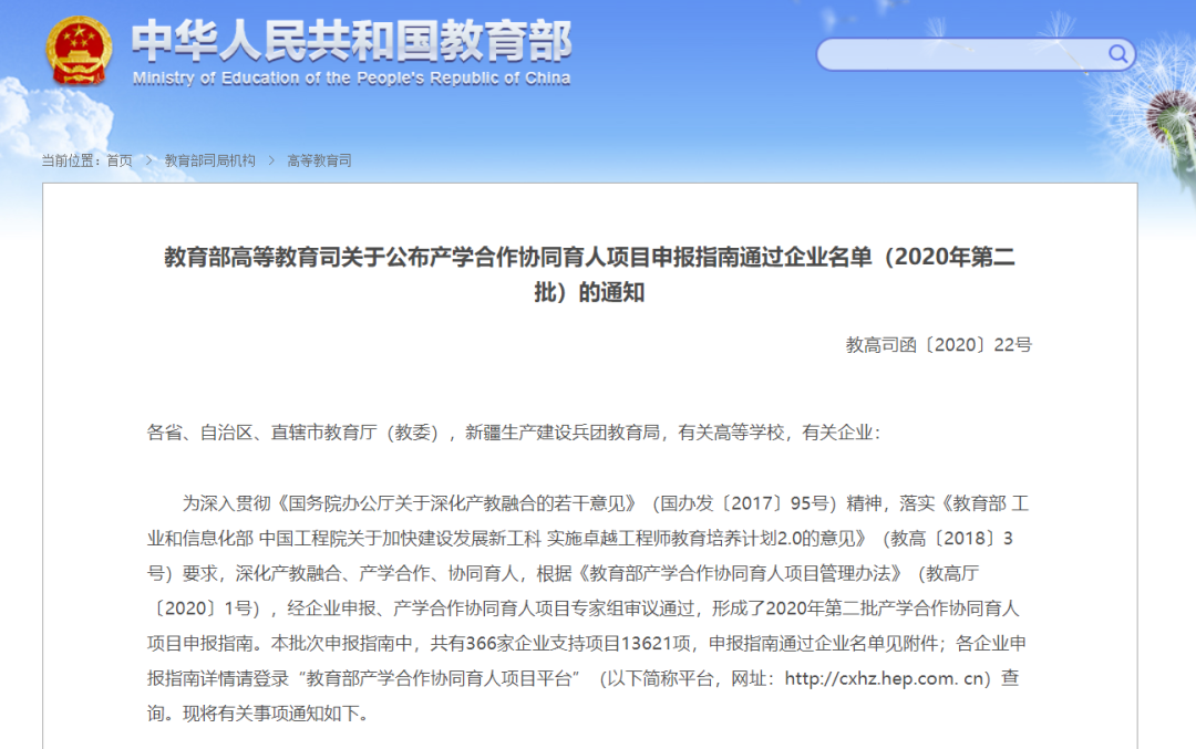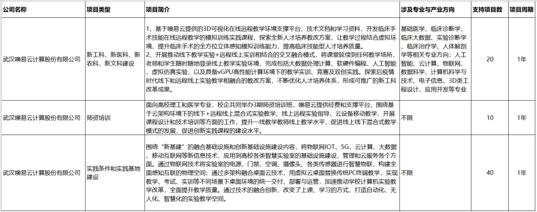 在本批次申報指南中,共有366家企業支持項目13621項。其中武漢噢易云計算股份有限公司申報的“新工科、新醫科、新農科、新文科建設項目”(20個)、“師資培訓項目”(10個)、“實踐條件和實踐基地建設項目”(40個)三大方向,共計70個項目入選教育部2020年第二批產學合作協同育人項目。