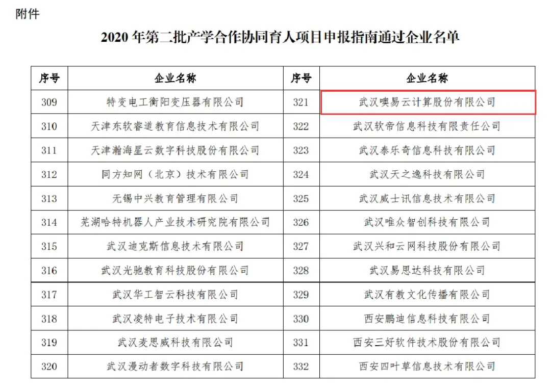 12月24日,教育部高等教育司正式發布了《關于公布產學合作協同育人項目申報指南通過企業名單(2020年第二批)的通知》,武漢噢易云計算股份有限公司成功獲批本批次產學合作協同育人項目70個。