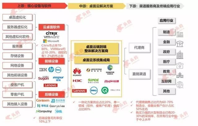 桌面云產(chǎn)業(yè)鏈上游環(huán)節(jié)提供核心軟件及硬件設(shè)備,包括前端的存儲(chǔ)設(shè)備、服務(wù)器、網(wǎng)絡(luò)設(shè)備,后端的瘦客戶機(jī)端或其他任何與網(wǎng)絡(luò)相連的終端設(shè)備,以及實(shí)現(xiàn)桌面虛擬化的軟件。中游參與者為桌面云解決方案提供商,為用戶提供一體化服務(wù)。下游渠道包括直銷與代理渠道,行業(yè)用戶囊括制造、金融、政府、醫(yī)療、教育、互聯(lián)網(wǎng)等行業(yè)企業(yè)。